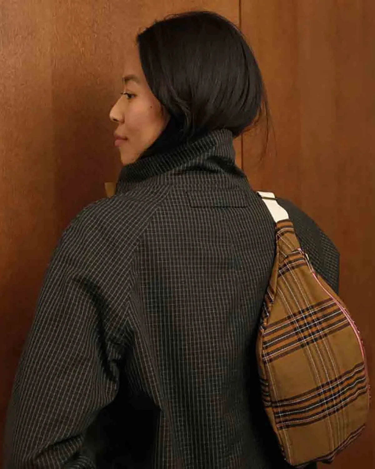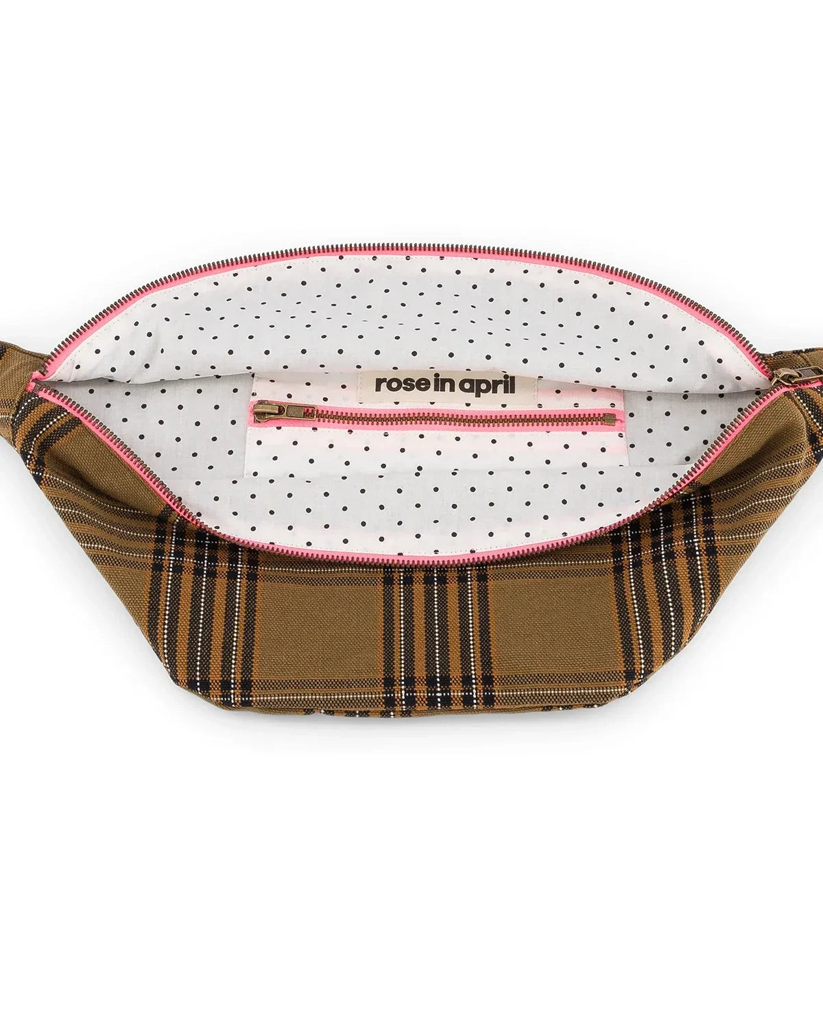 Umhängetasche in Braun mit Karomuster und Details in Neonpink. Ideal, um unterwegs flexibel und unbeschwert zu bleiben.