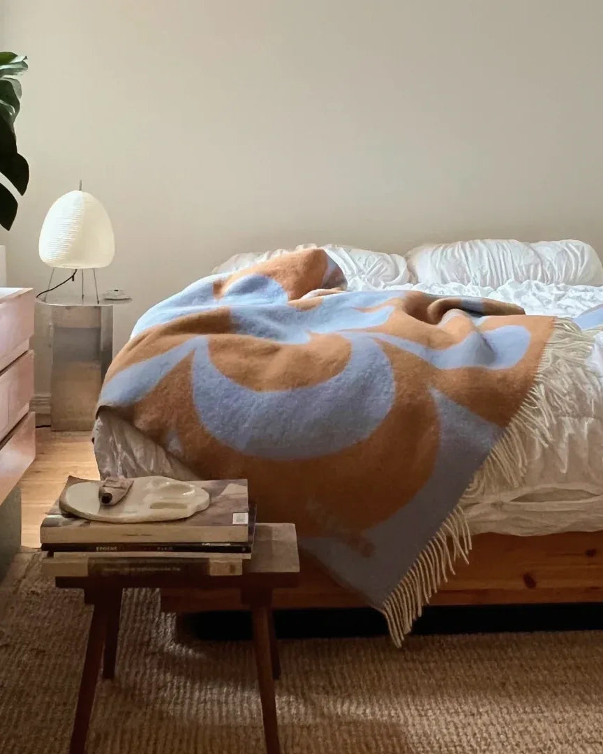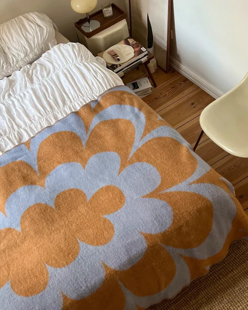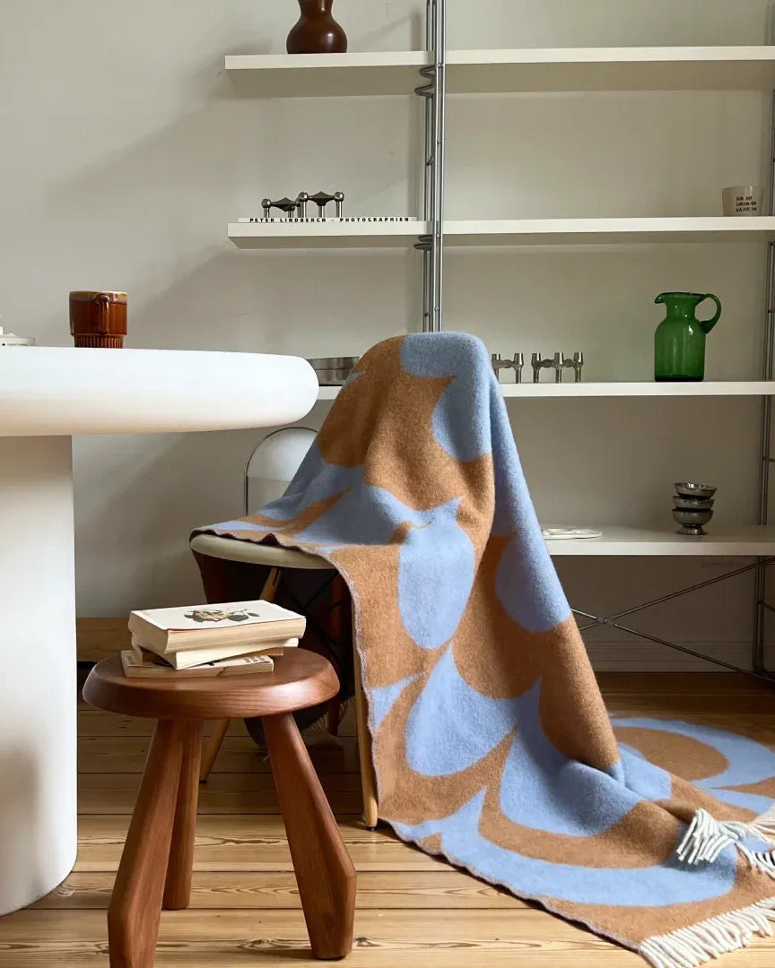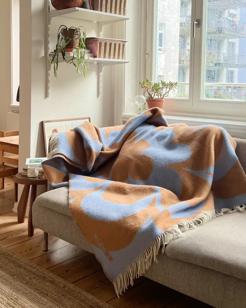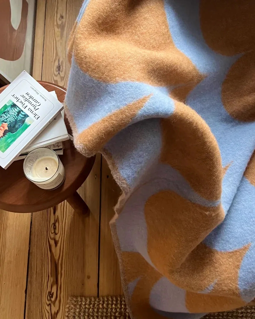 Sofadeck in Hellblau und Karamell mit großem Blütenmuster aus weicher Wolle, ideal für warme Momente und gemütliche Farbakzente.