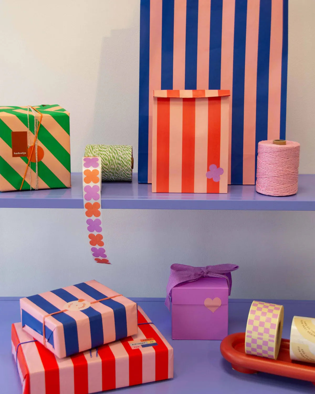 Geschenktasche mit breiten Streifen in Rot- und Rosatönen. Eignet sich für kleine Geschenke und bringt einen lebhaften Farbkontrast.