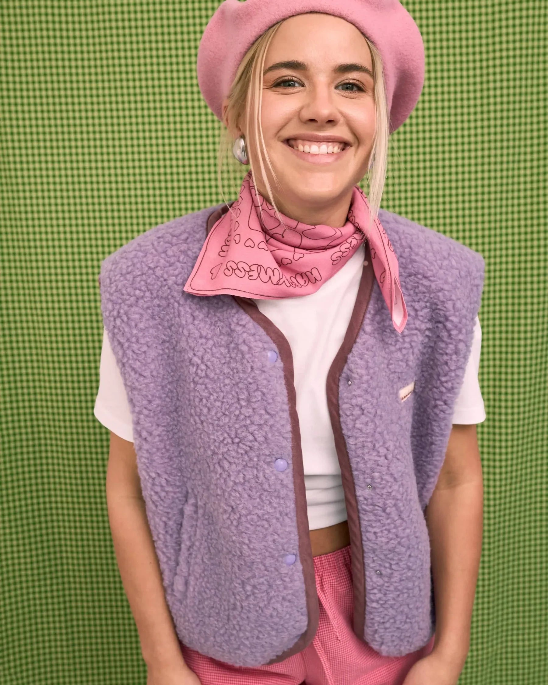 Merino Weste in Flieder mit lockerem Schnitt und klarer Form. Gibt dir angenehme Wärme und passt gut zu entspannten Alltagslooks.