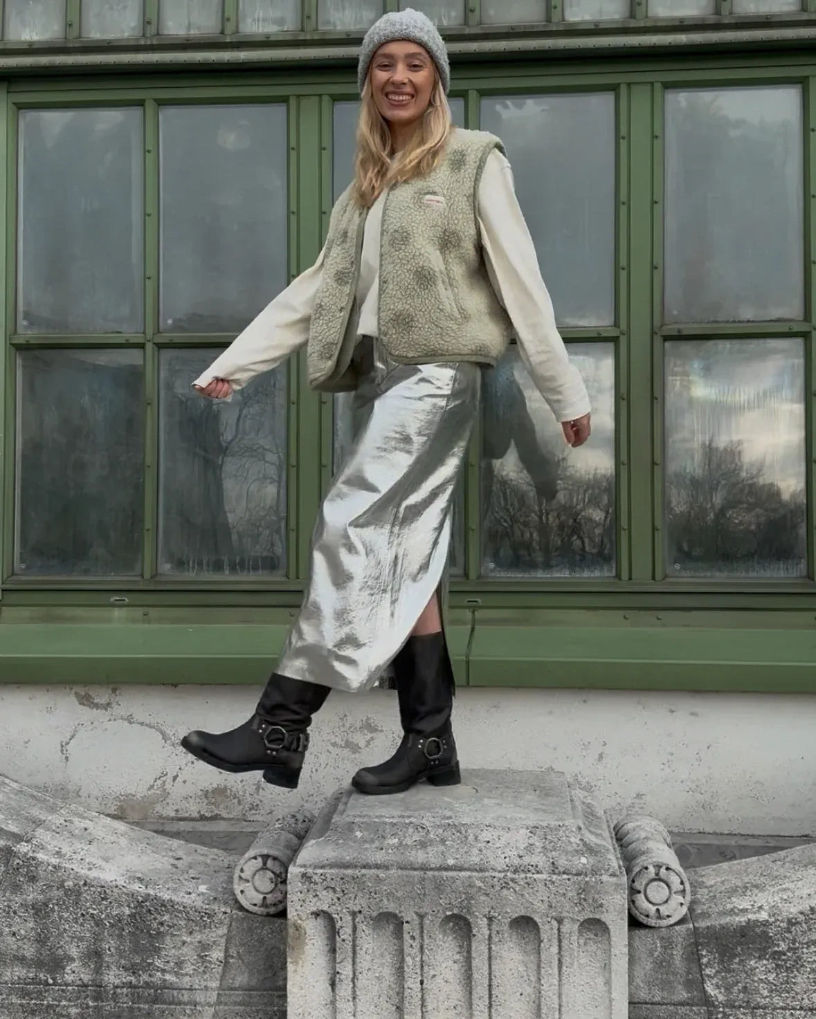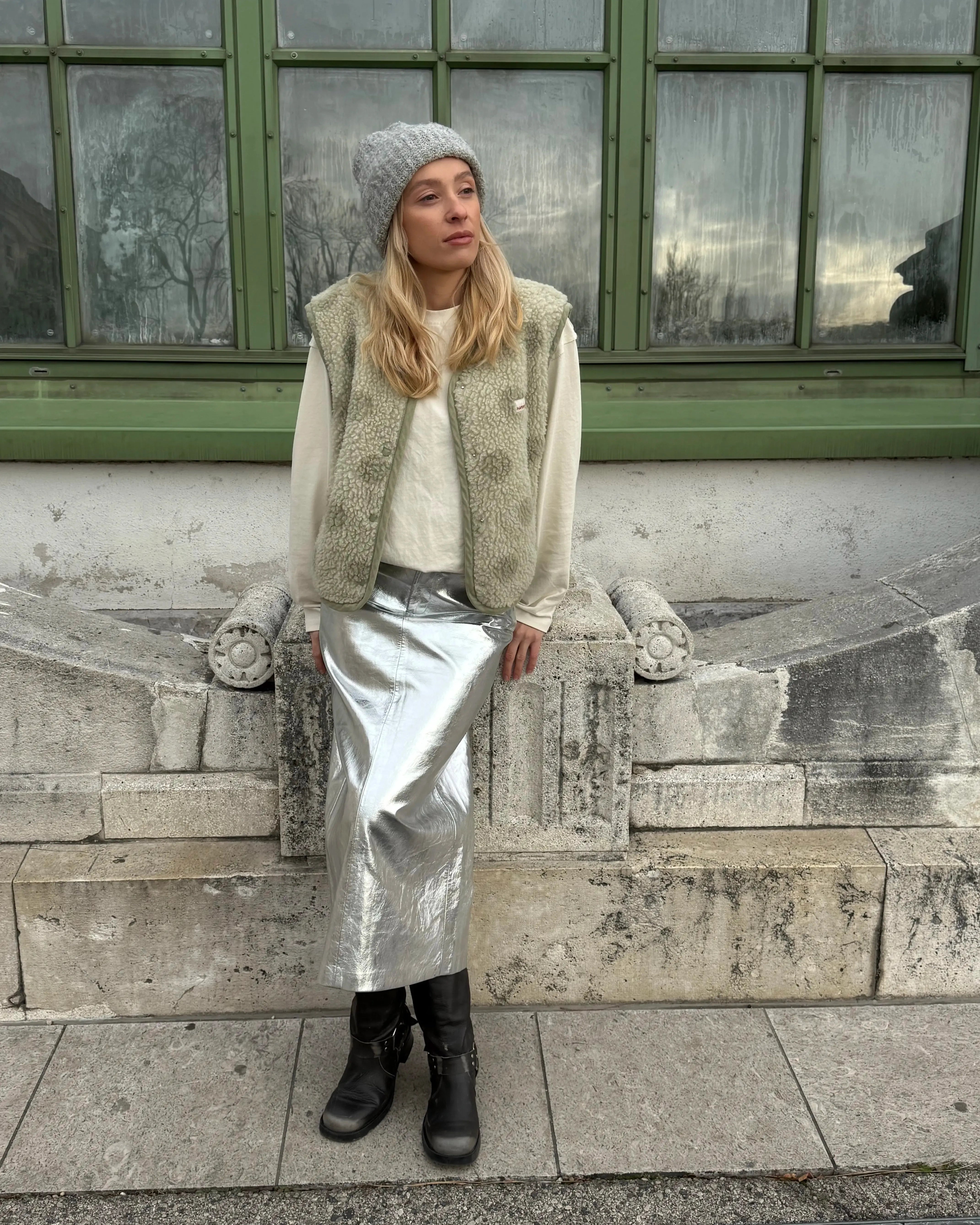 Die Weste fällt sehr groß aus. Wir empfehlen dir, eine Nummer kleiner zu wählen – selbst dann sitzt sie noch oversized.