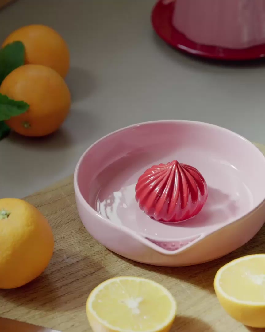 Verspielte Zitruspresse aus Kersmik in Pink mit Dessert-Optik, dekoratives Küchenobjekt und praktischer Helfer zum Auspressen von Zitronen.