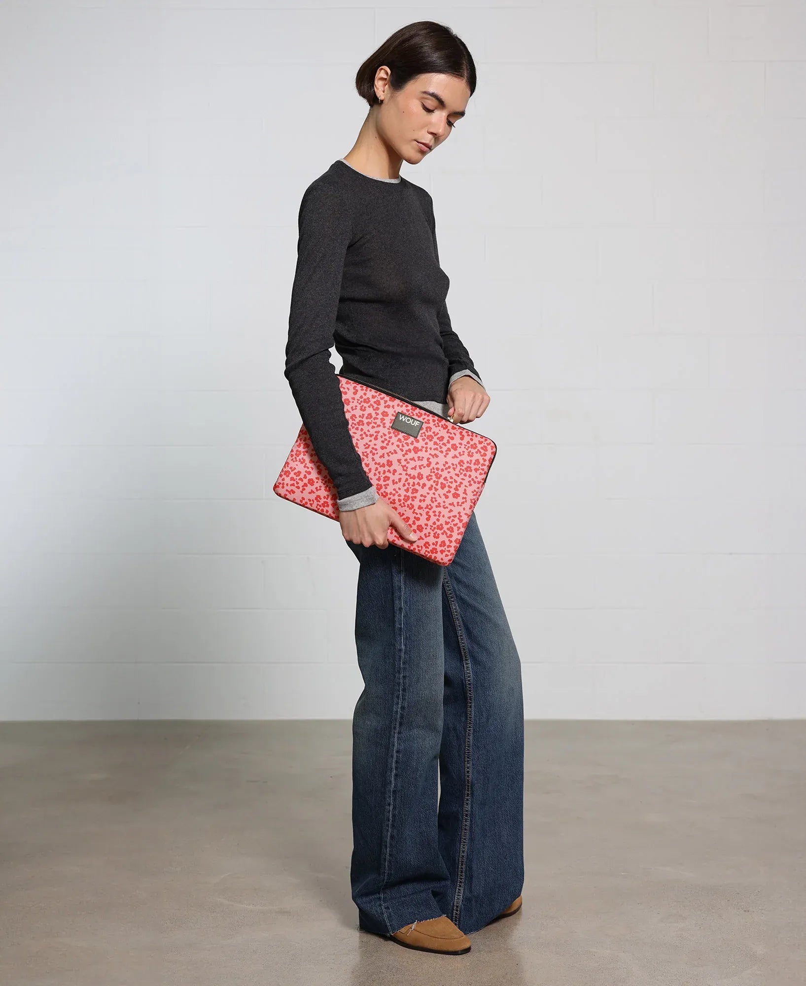 Laptop-Hülle mit rotem Leo-Print aus recyceltem Polyester – wasserabweisend, gepolstert und passend für 13 Zoll / 14 Zoll Laptops.