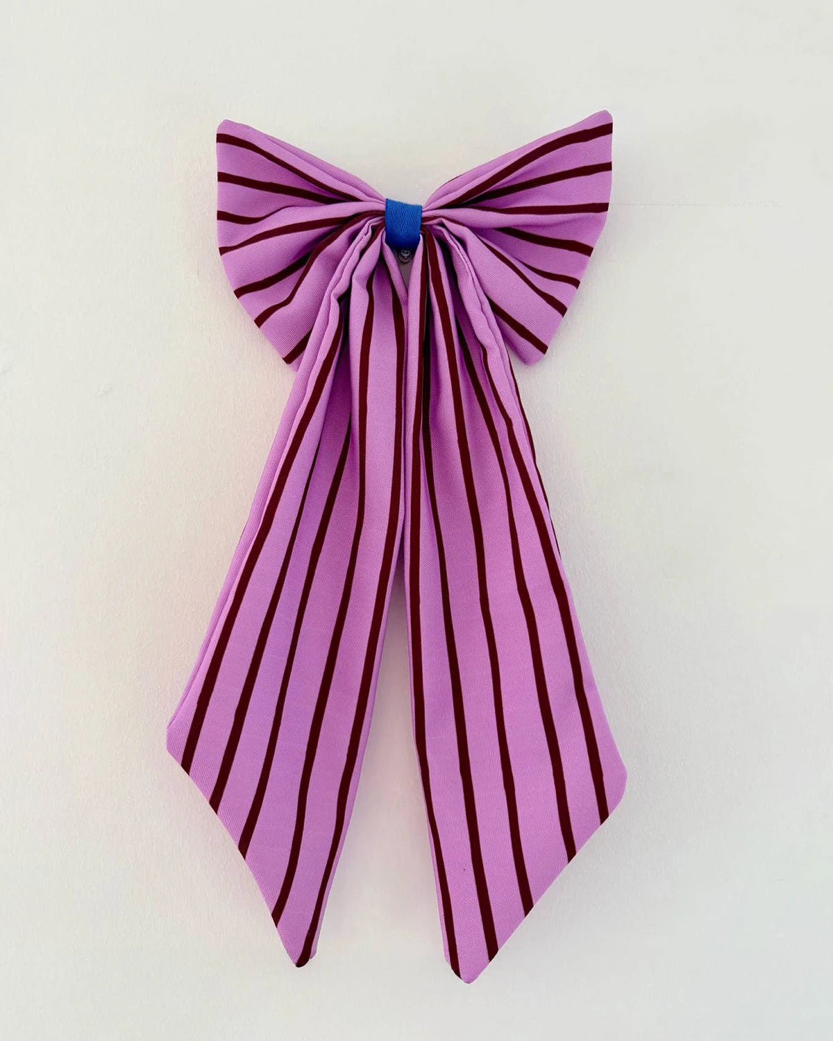 Weihnachtsschleife in Lila und Dunkelrot mit markantem Streifenlook ideal für deine festliche Deko an Tür, Wand oder am Weihnachtsbaum zu Hause.