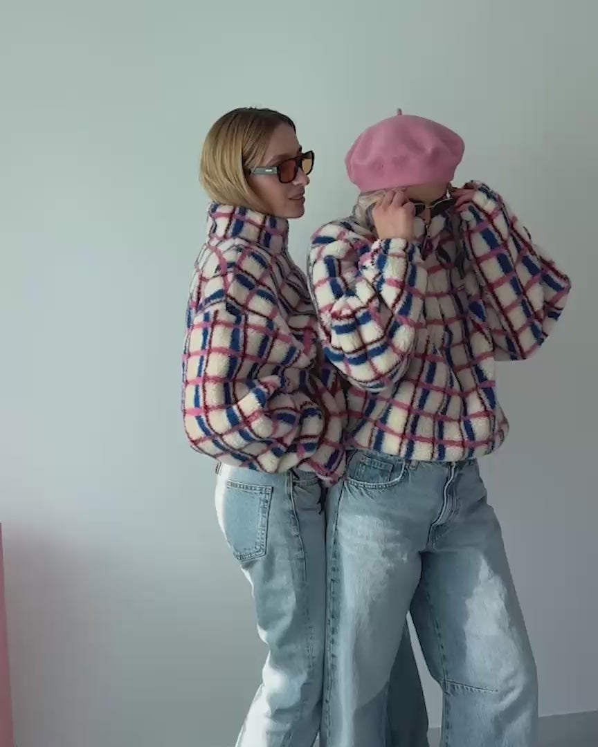 Weiche Oversized-Jacke aus Merinowolle mit markantem Karo-Muster in Pink, Blau und Creme. Ideal für Übergangstemperaturen von 5–15 °C.