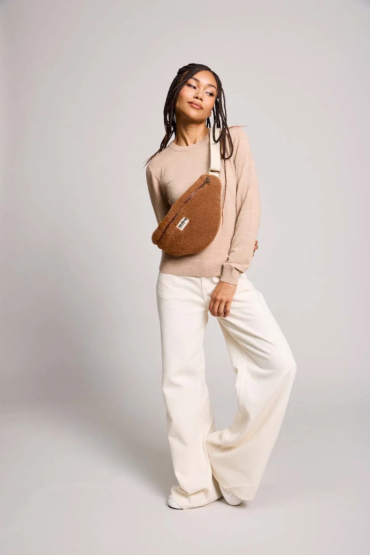 Weiche Gürteltasche aus braunem Teddy‑Stoff; ideal für Alltag und Reisen, mit verstellbarem Gurt und fairer Herstellung durch Hindbag in Indien.