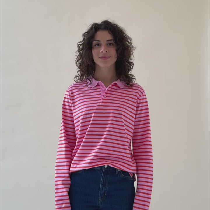 Gestreiftes Poloshirt aus Bio-Baumwolle mit markanter Pink-Rot-Kombination, geripptem Kragen und lockerem Schnitt für einen modernen Preppy-Look im Alltag.