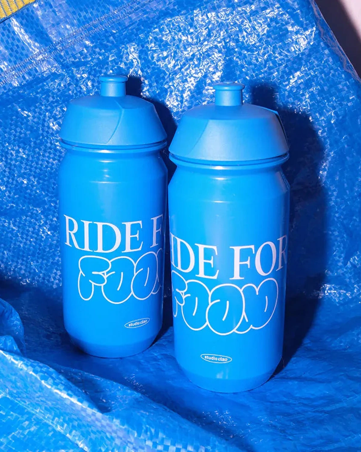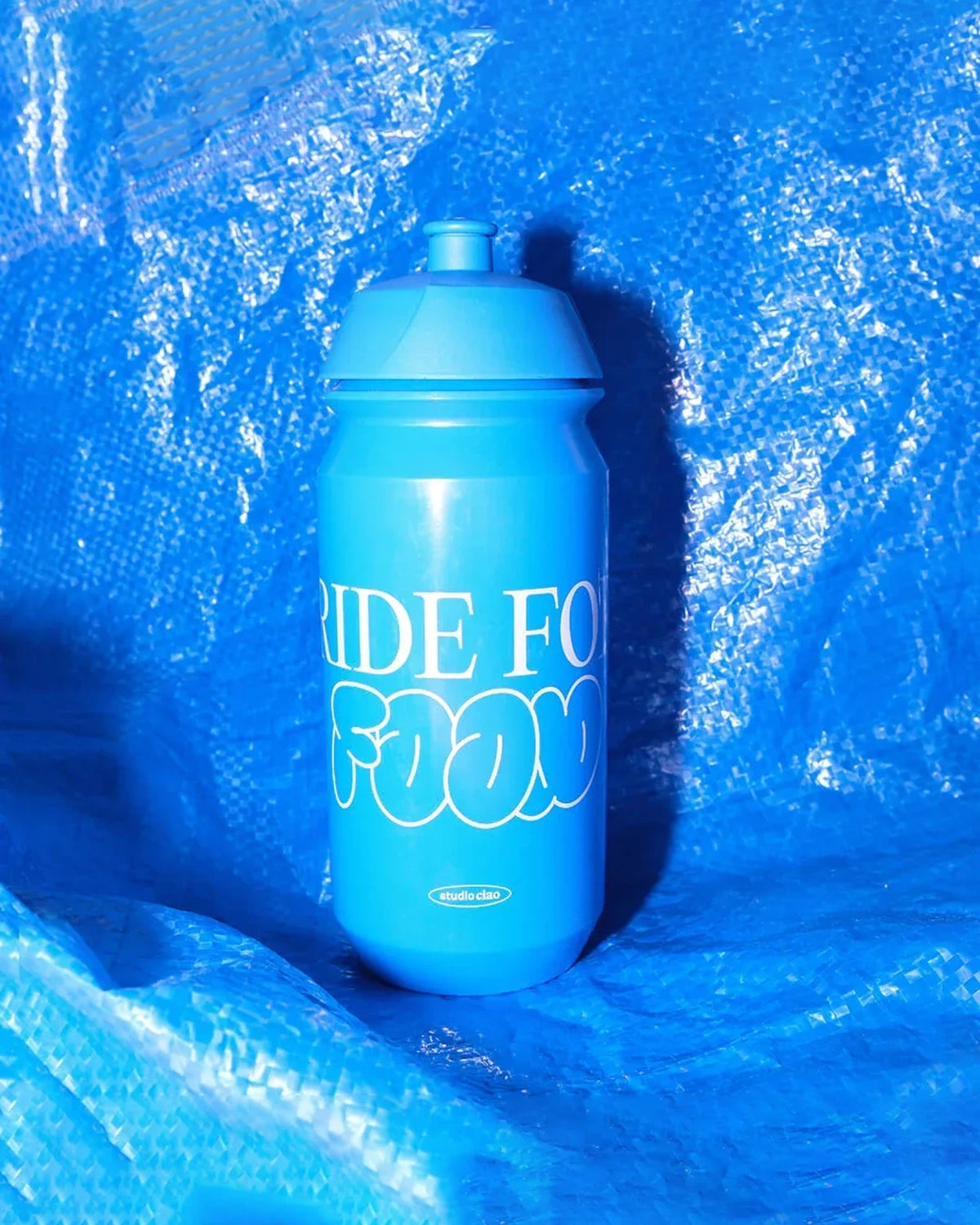 Sportliche 500-ml-Trinkflasche in Blau mit „Ride for food“-Print – ideal fürs Radfahren, Training und unterwegs, auslaufsicher und pflegeleicht.